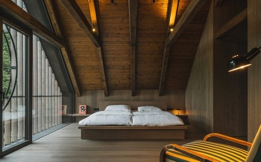 Poziom sypialni wyposażono w cztery otwarte szczyty z przeszkleniami, które od zewnątrz zakrywają pionowe drewniane listwy z kolistymi wycięciami. Na tym samym piętrze znajduje się też balkon, z którego rozciąga się szeroki widok na dolinę.