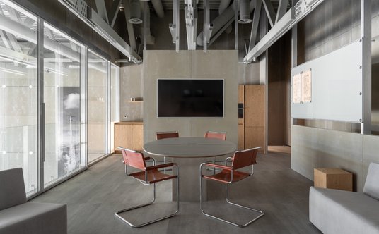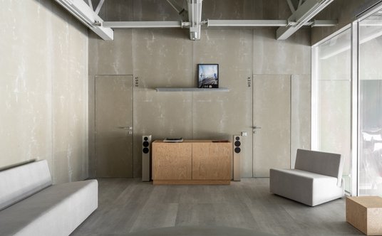 Aby zyskać odpowiednią przestrzeń do pracy – zarówno teraz, jak i po wojnie – członkowie zespołu postanowili wykorzystać hangar, w którym przechowywali swój sprzęt. Misję zaprojektowania nowej przestrzeni powierzono architektom z kijowskiej pracowni +kouple. Założeniem głównego projektanta, Dana Wachramiejewa, było stworzenie praktycznych i dających się modyfikować wnętrz o czystych, minimalistycznych formach.