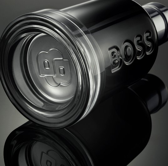 Charakterystyczna kompozycja znalazła swoje odzwierciedlenie również w designie. Klasyczna butelka Boss zyskała nowe oblicze – jest wykonana z czarnego lakierowanego szkła z fakturą przypominającą skórę. Gradient czerni przechodzącej w szarość nadaje całości męski charakter.