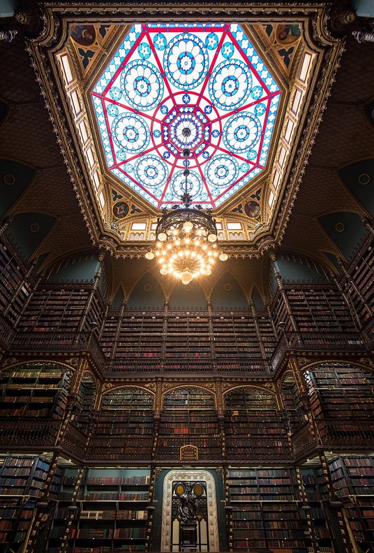 Nie trzeba być fanem literatury, żeby wnętrza Real Gabinete Português de Leitura budziły zachwyt. Zabytkowe, bogato zdobione półki z ciemnego drewna wypełniają kilkusetletnie woluminy. Złote polichromie rozjaśnia naturalne światło z przeszklonego sufitu oraz przytłumiony blask lamp i żyrandoli z epoki.