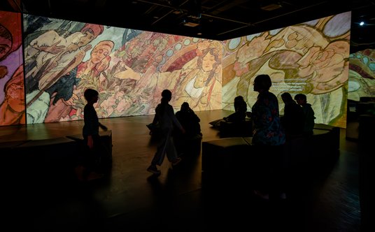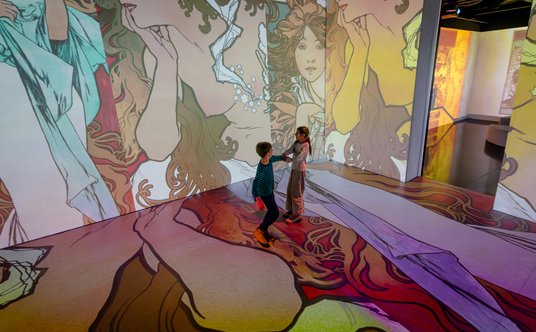Ekspozycja na 800 metrach kwadratowych przestrzeni Art Box Experience w warszawskim Norblinie łączy sztukę z nowoczesnymi technologiami, prezentując blisko 100 dzieł artysty. Dzięki projekcjom, muzyce, efektom dźwiękowym i zapachowym, można w pełni zanurzyć się w świecie Alfonsa Muchy, odkrywając jego słynne plakaty, grafiki, projekty architektoniczne i jubilerskie.