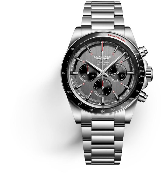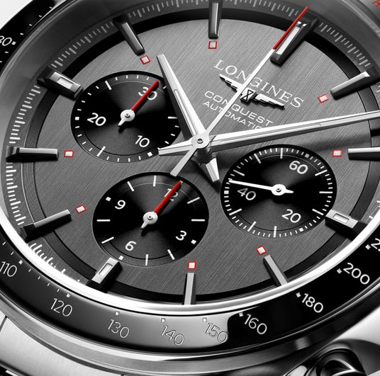 Longines Conquest Chrono Ski Edition wyróżnia między innymi wertykalnie satynowana, antracytowa tarcza z kontrastującymi subtarczami sekundnika i liczników chronografu, a także pierścień lunety z czarną ceramiczną wkładką, na którą naniesiono skalę tachometru. Wewnątrz koperty pracuje stworzony specjalnie dla Longines kaliber L898.5 wyposażony w krzemowy włos balansu, co zapewnia odporność na działanie pól magnetycznych, szkodliwych dla tradycyjnych zegarków mechanicznych.