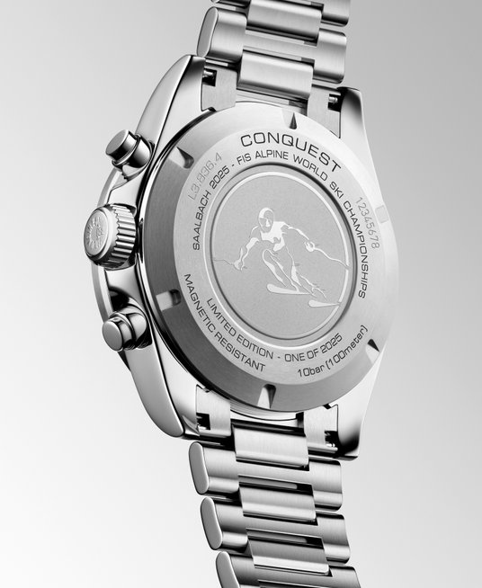 Longines Conquest Chrono Ski Edition to przedstawiciel cieszącej się dużym powodzeniem sportowej kolekcji Conquest. Tym razem powstał model stworzony z myślą o mistrzostwach świata w Saalbach. Zegarek, z kopertą o średnicy 42 milimetrów, wykonaną ze stali szlachetnej o przemiennie polerowanych i satynowanych powierzchniach, objęty jest limitacją – wyprodukowanych zostanie jedynie 2025 egzemplarzy.